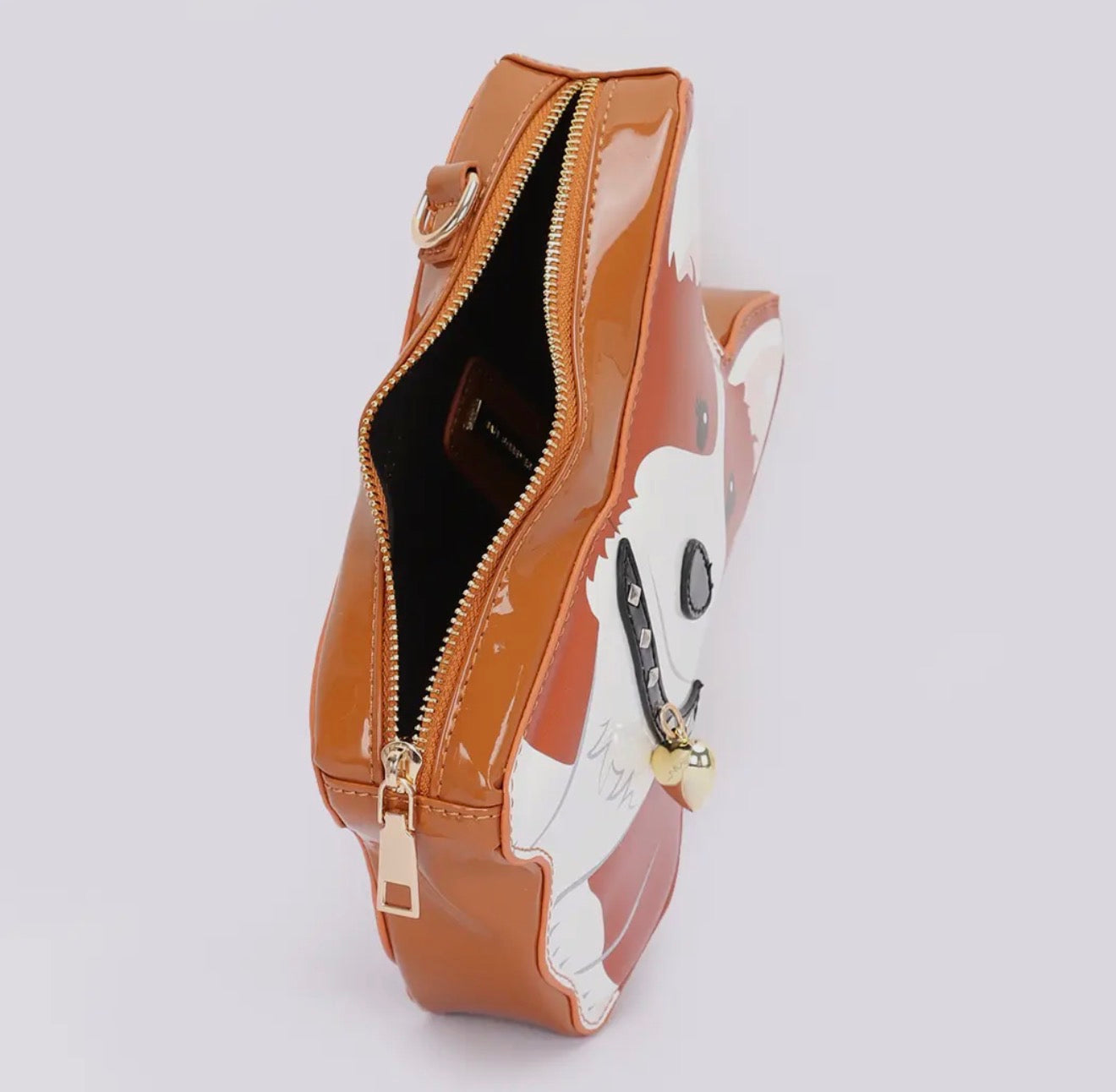 This charming small dog purse features a corgi, a convenient strap for easy carrying and easy cleaning polyvinyl.