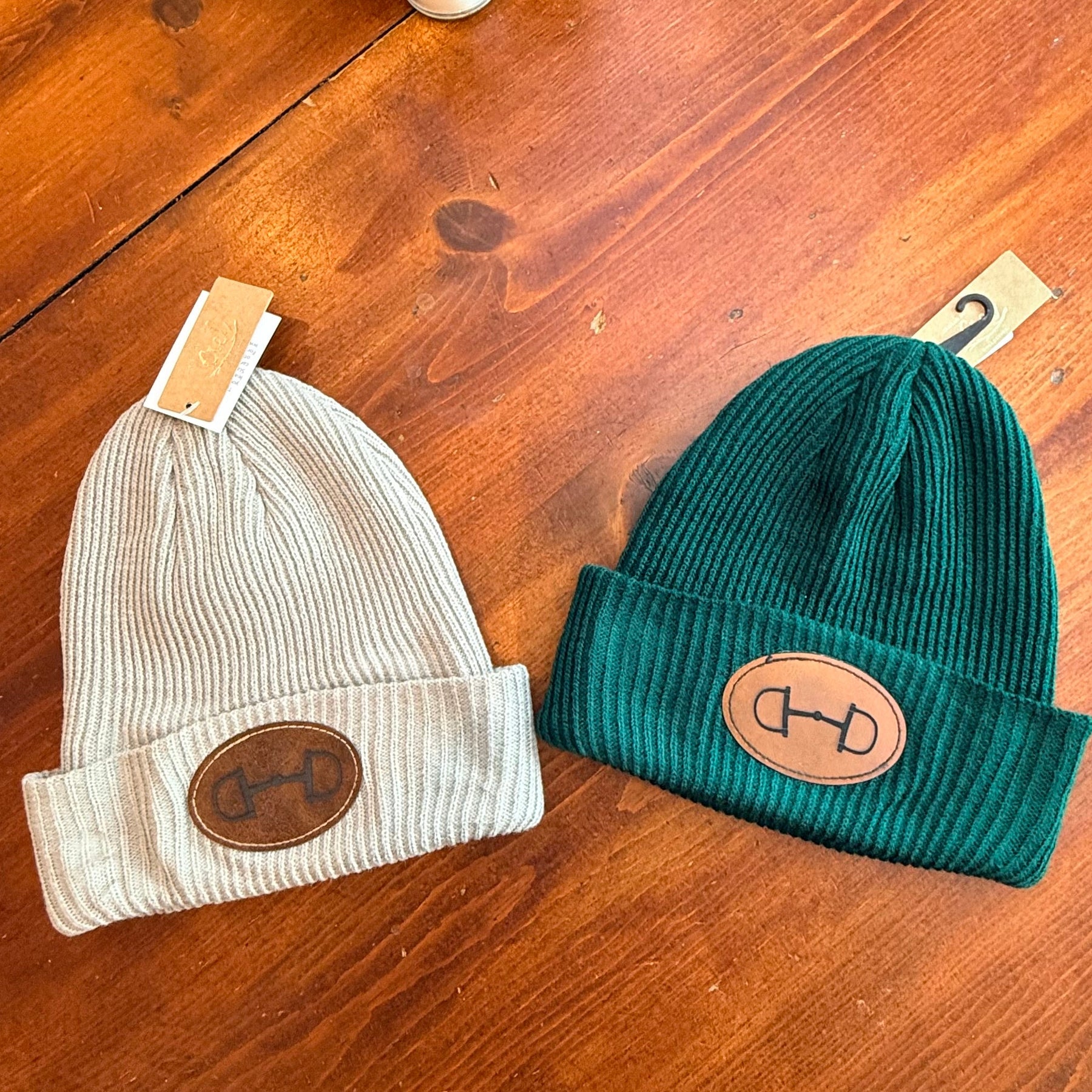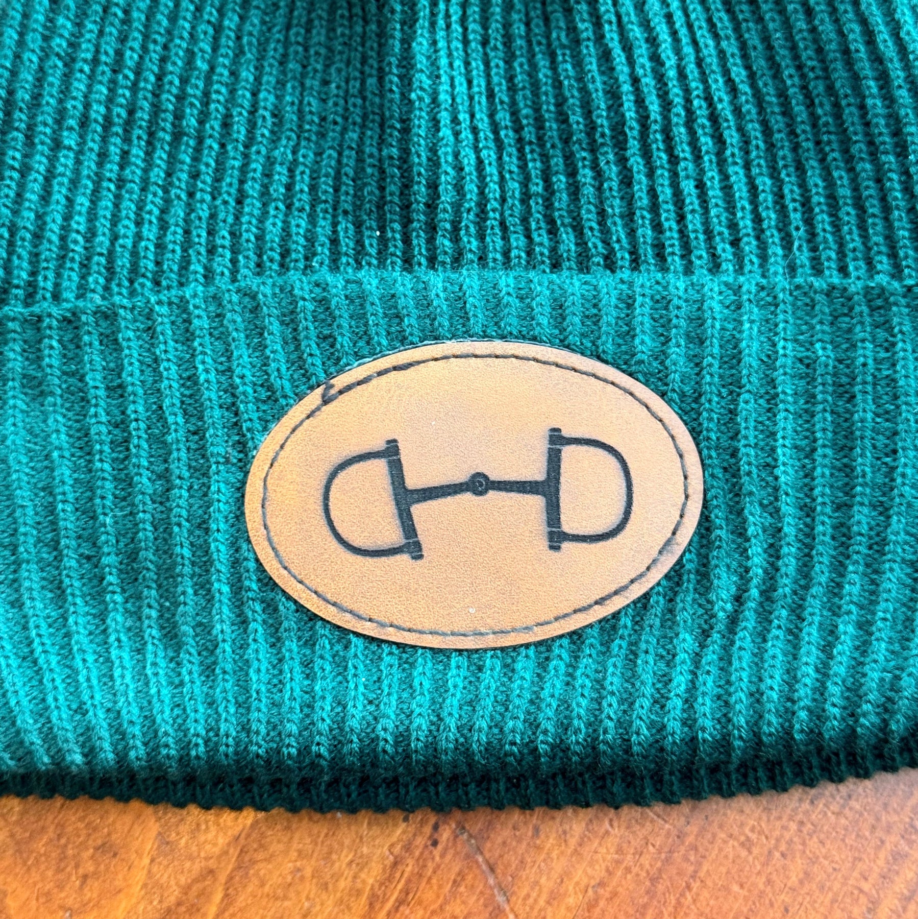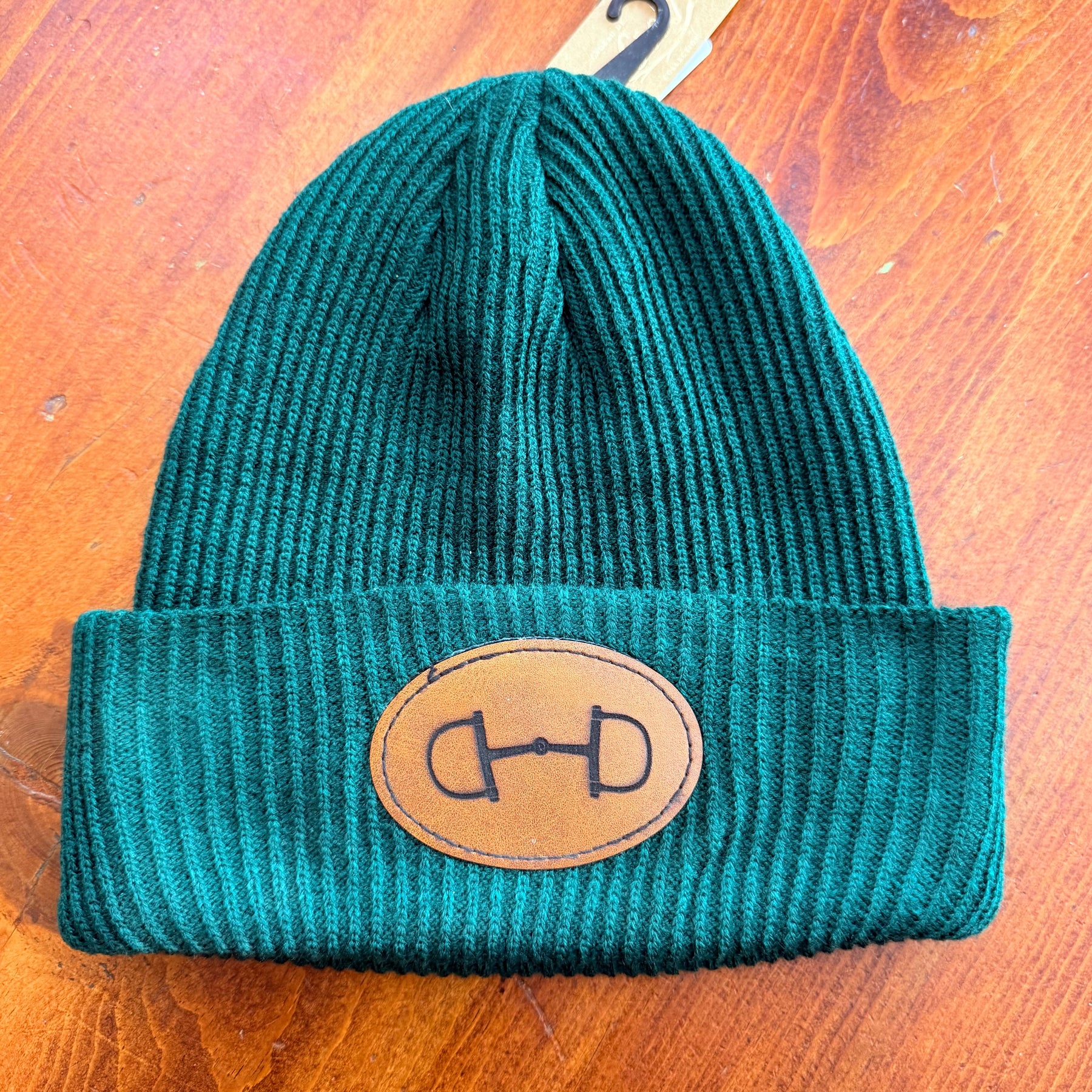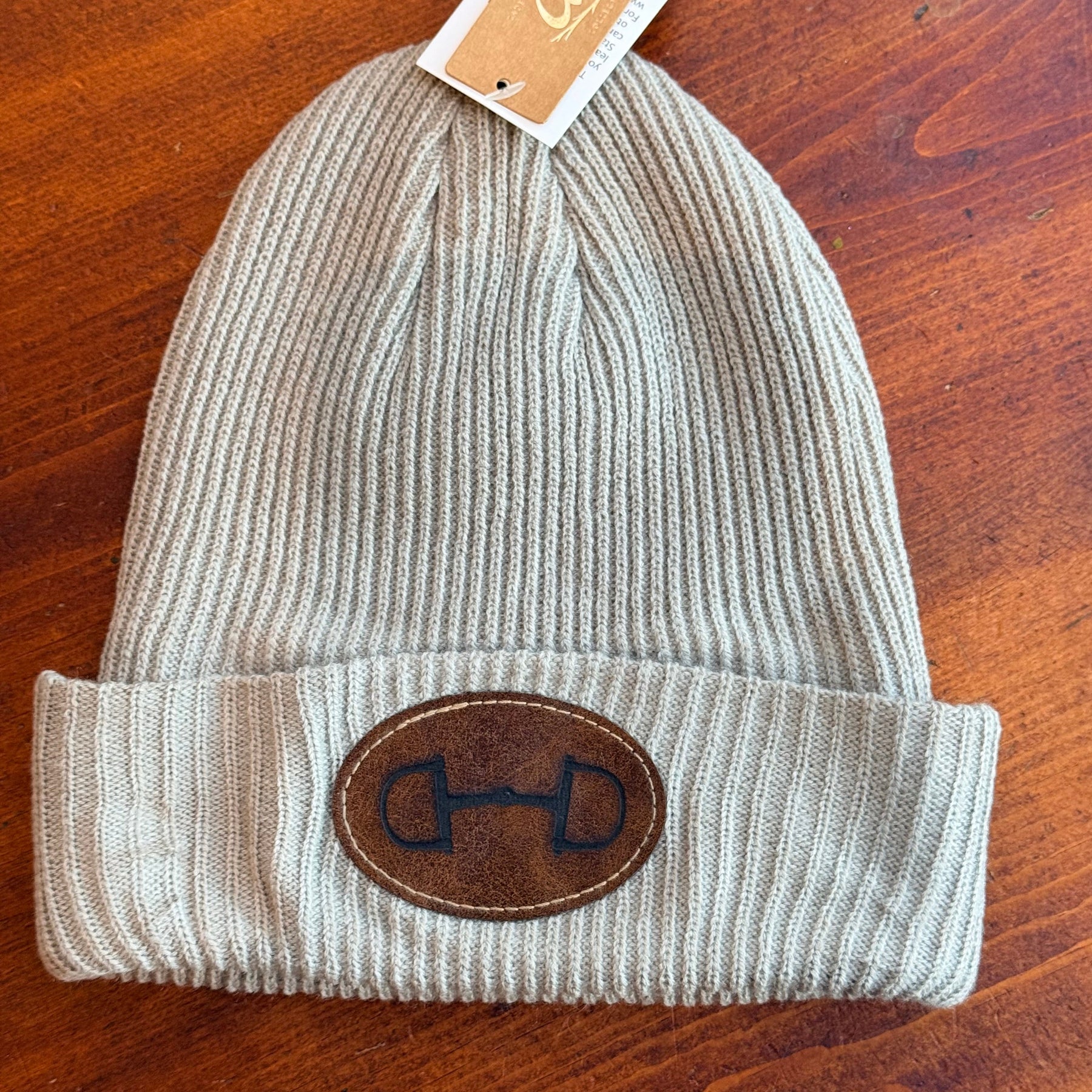 Why not be warm and stylish? Faux leather patch features a dee bit design and is affixed to the front of a cozy beanie.