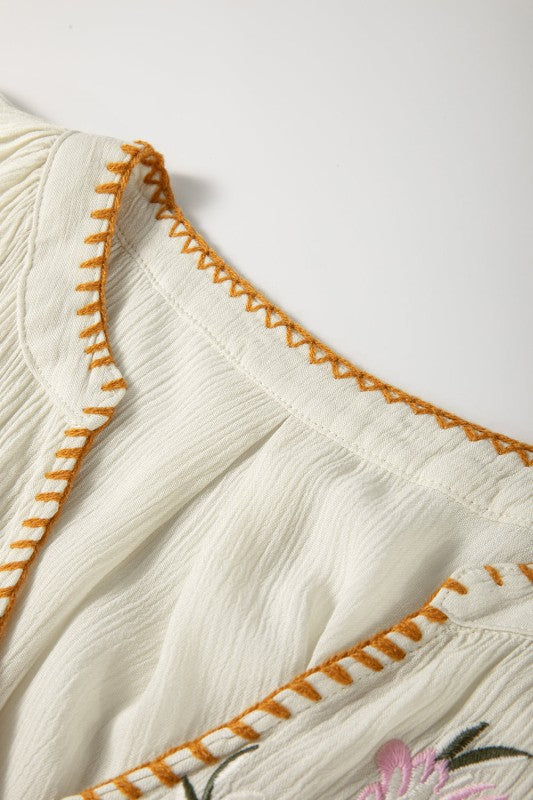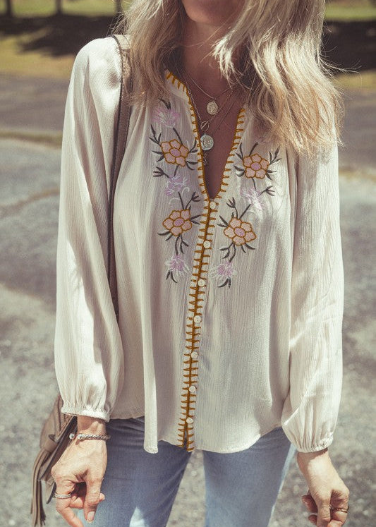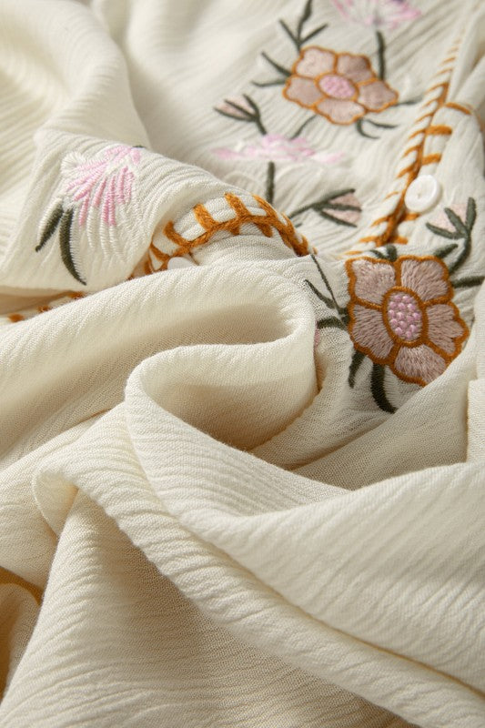 Our Floral Boho Top offers intricate embroidery and refined craftsmanship. The textured gauze fabric creates visual depth and interest a relaxed fit. Front button closure, and elastic cuffs. It combines artisanal detail with modern sensibility.