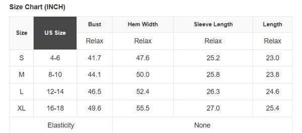 See size chart for approximate measurements.