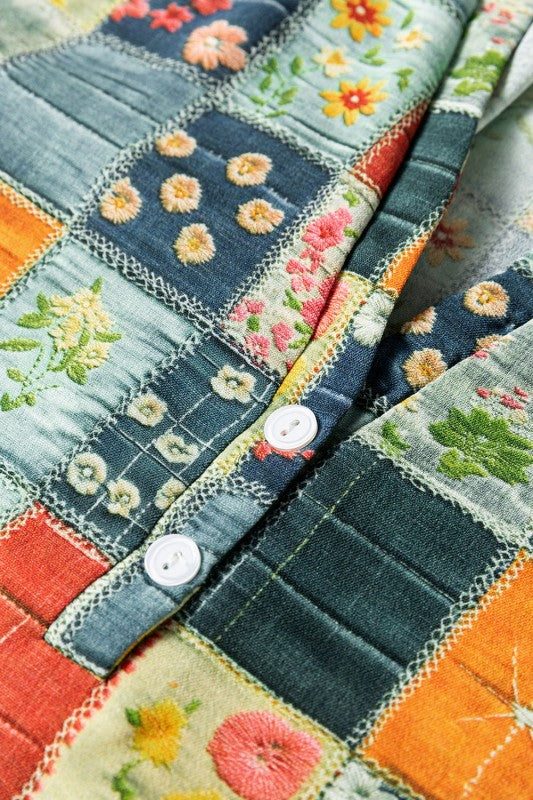 Add a splash of joy to your wardrobe with this playful blouse adorned with fun appliqued daisies or a patchwork pattern. Its flattering neckline and crisp collar frame your face beautifully, while the half placket adds a touch of relaxed, effortless style.