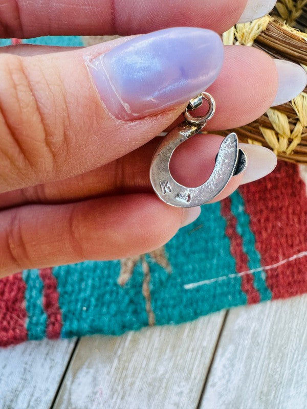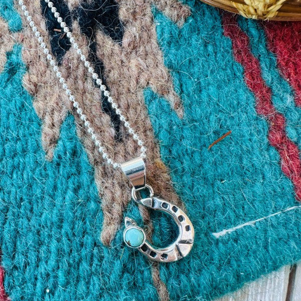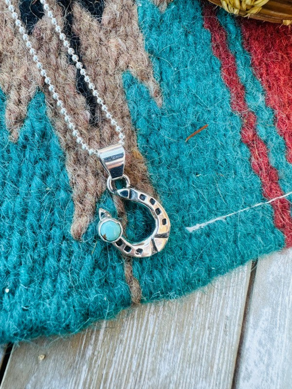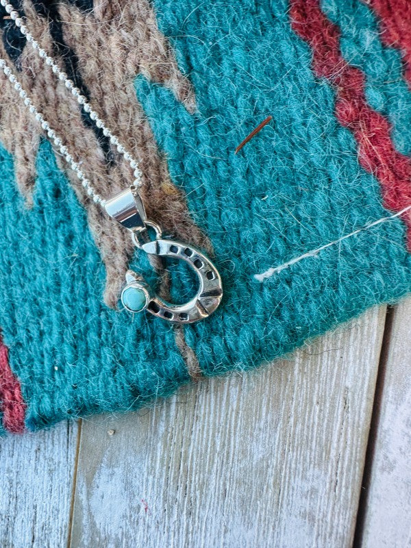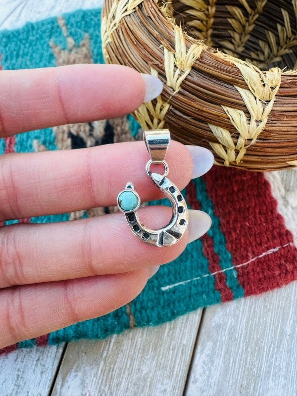 Beautiful Handcrafted Turquoise and Sterling Silver Horseshoe Mini Pendant. This pendant measures 1 inch long and 1/2 of an inch wide. Bale measures just over 1/8 of an inch across. Signed by the artist and stamped Sterling.
