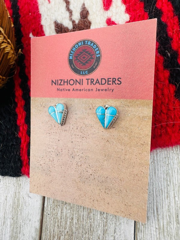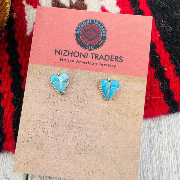 Beautiful Handcrafted Sterling Silver and Turquoise Inlay Heart Stud Earrings. These measure 1/2 of an inch long and just over 3/8 of an inch wide. Signed by the artist.