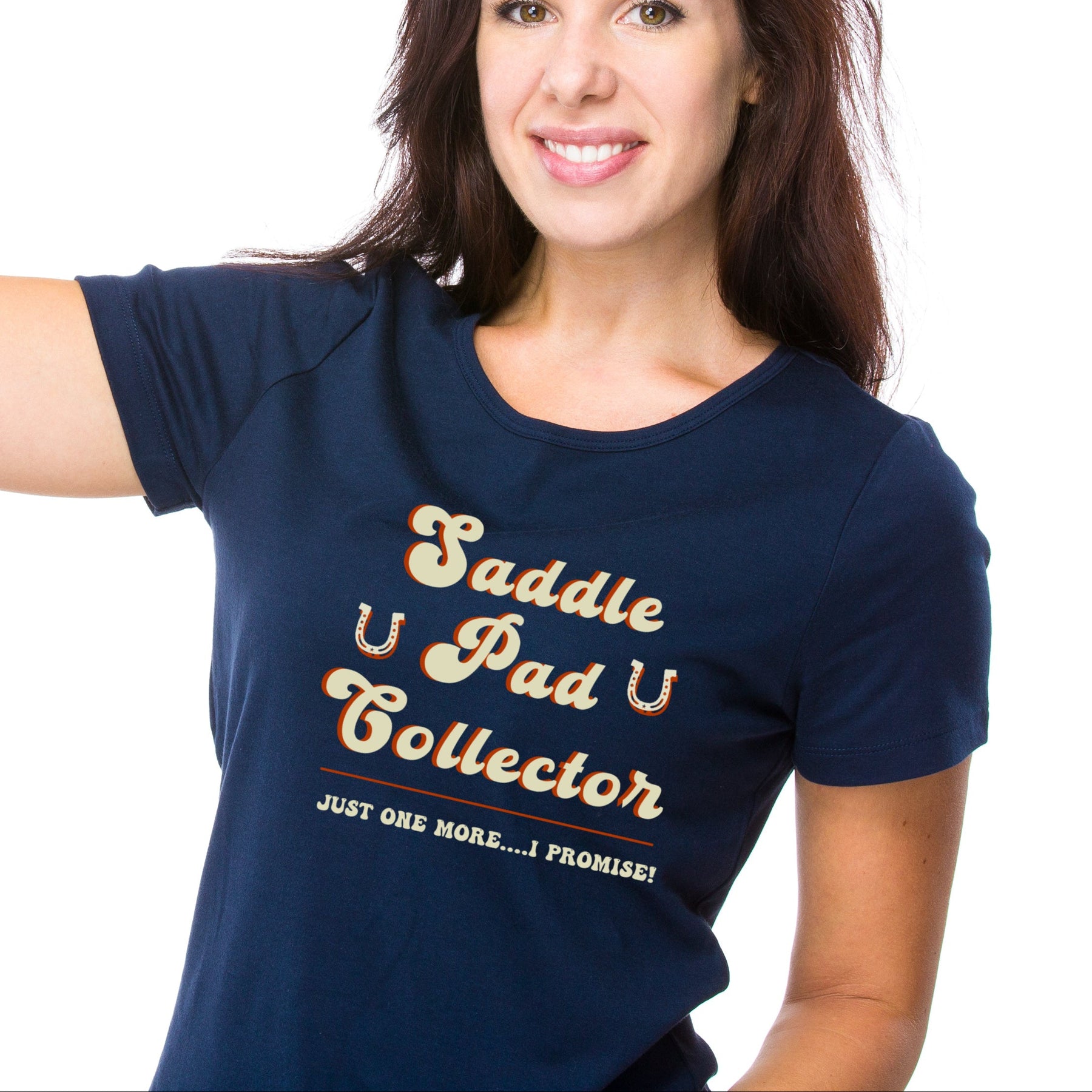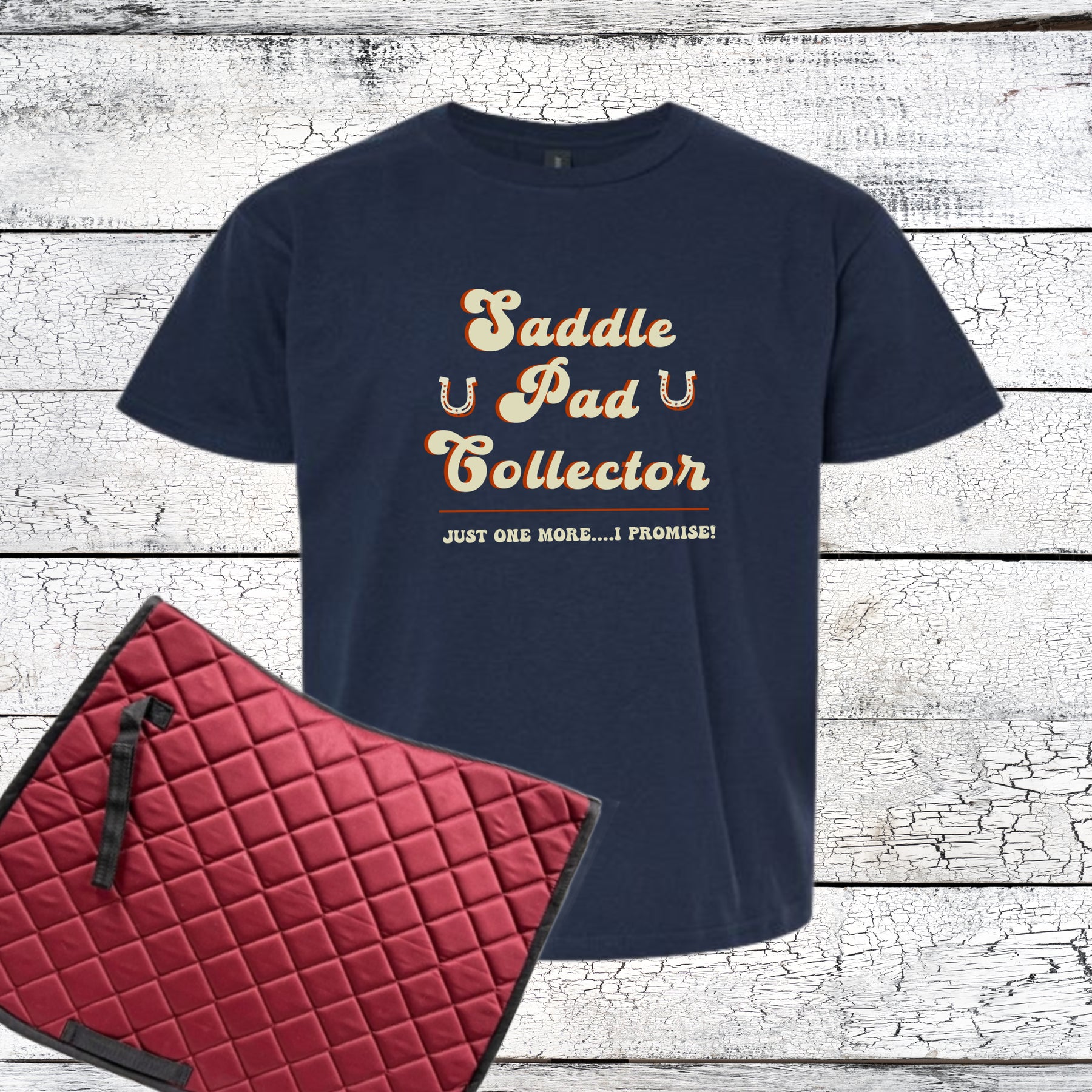 Are you guilty of seeing a new saddle pad and buying it even if you don't need it? How can we resist though? Here's a design just for you! Wear this 100% cotton tee or hoodie and admit to your guilty pleasure.