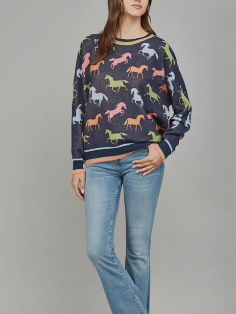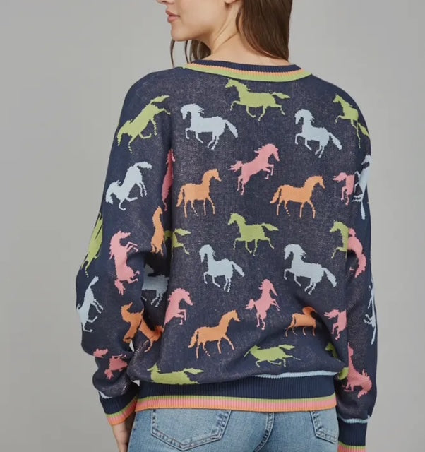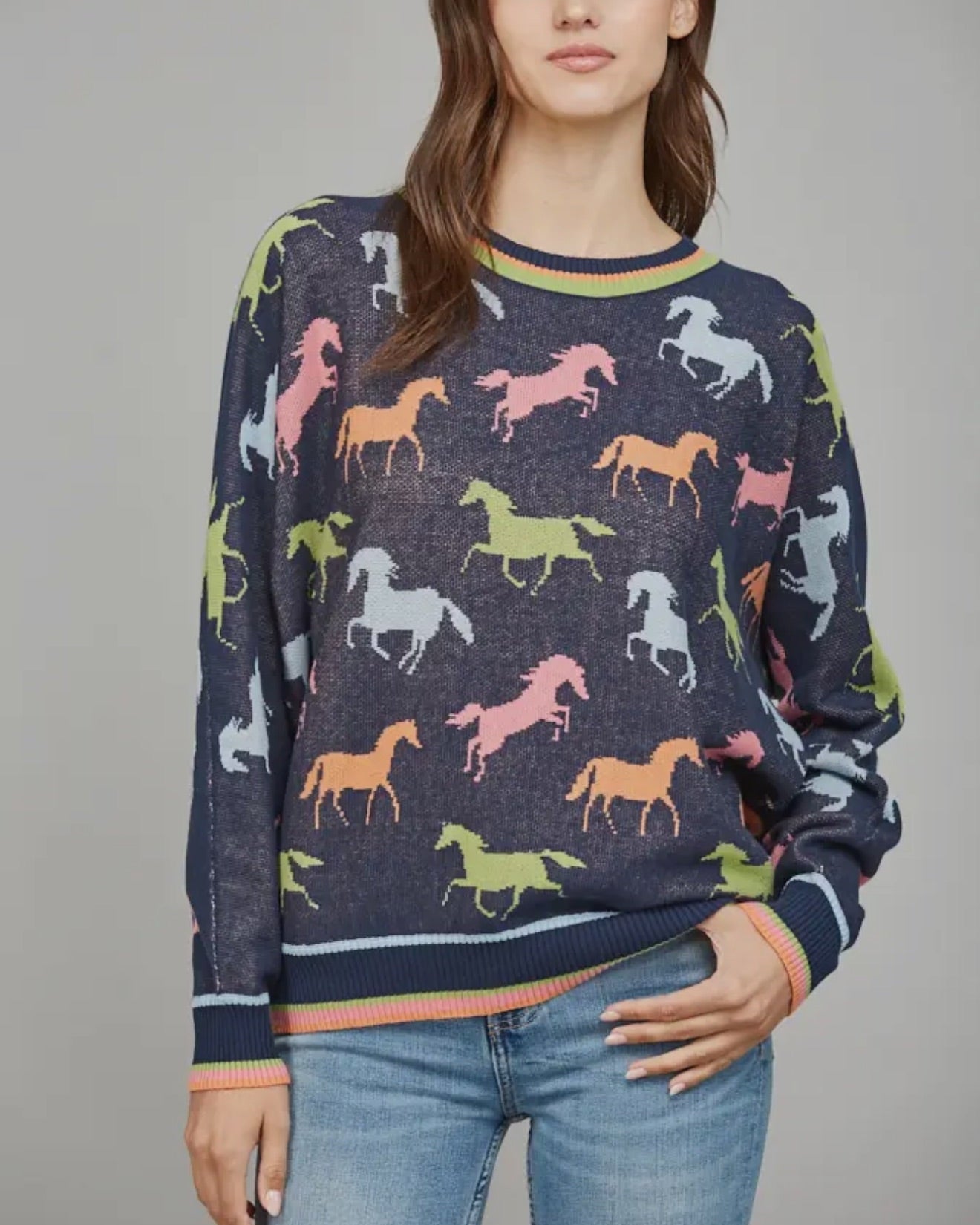 Colorful, comfortable and very equestrian! Our Colorful Horses patterned crew neck sweater is 100% cotton, with ribbed cuffs, bottom and neckline. Embrace your love for horses and wear it to ride or out and about!