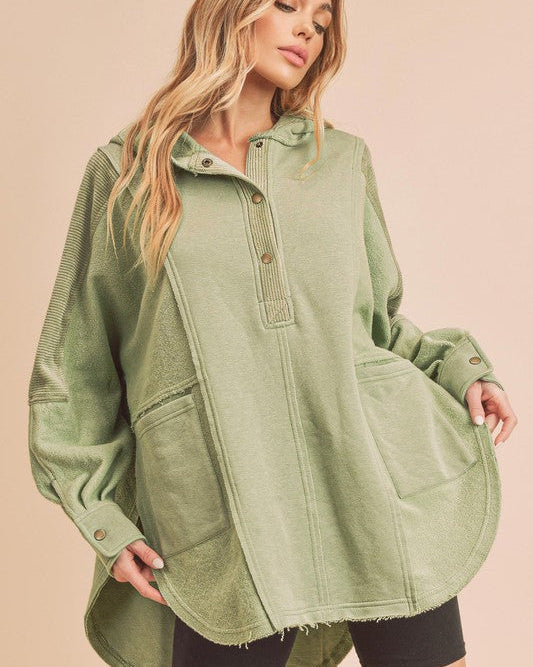 Our favorite mixed media Dove Pullover features an oversized 3/4 button fit, contrasting corduroy panels with raw seaming throughout. She is perfect for layering up or down.