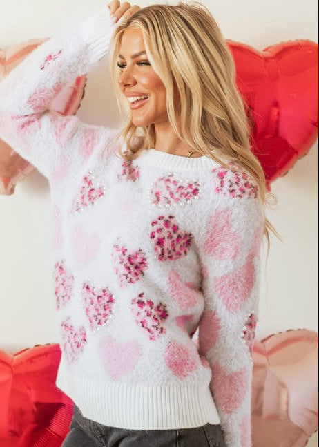 Leopard Heart Pearl Beaded Fuzzy Sweater