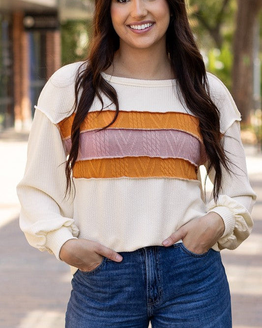 Is it a sweatshirt or a sweater? A little of both! This corded top stands out with a unique textured look, the artistry of knit patchwork sweater pieces, comfort and style with trendy drop shoulder sleeves.