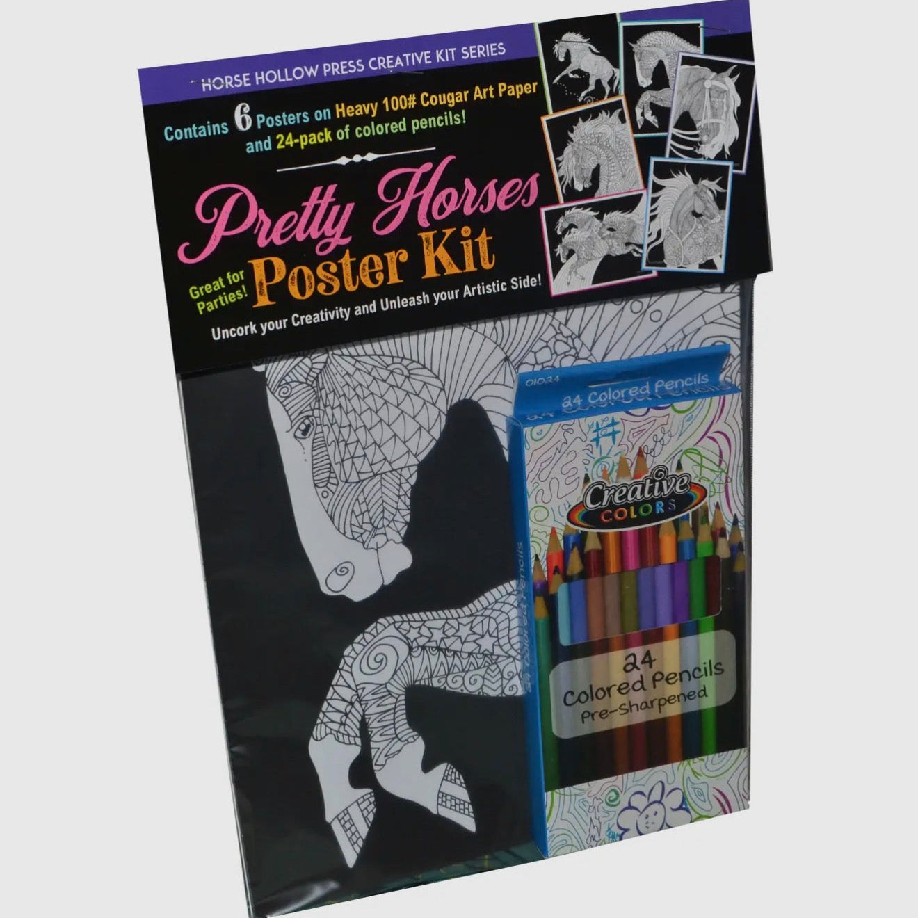 Best-selling coloring kit for horse lovers! Includes 24-count colored pencils and 6 detail illustrations on heavy duty card stock.