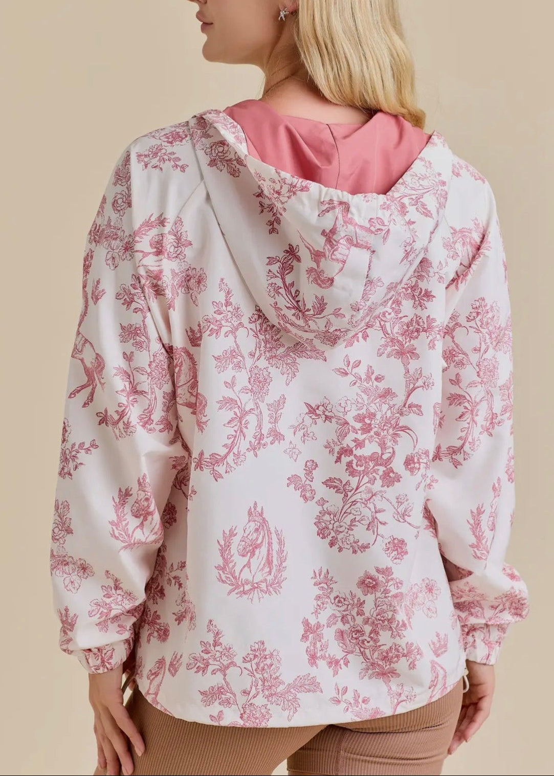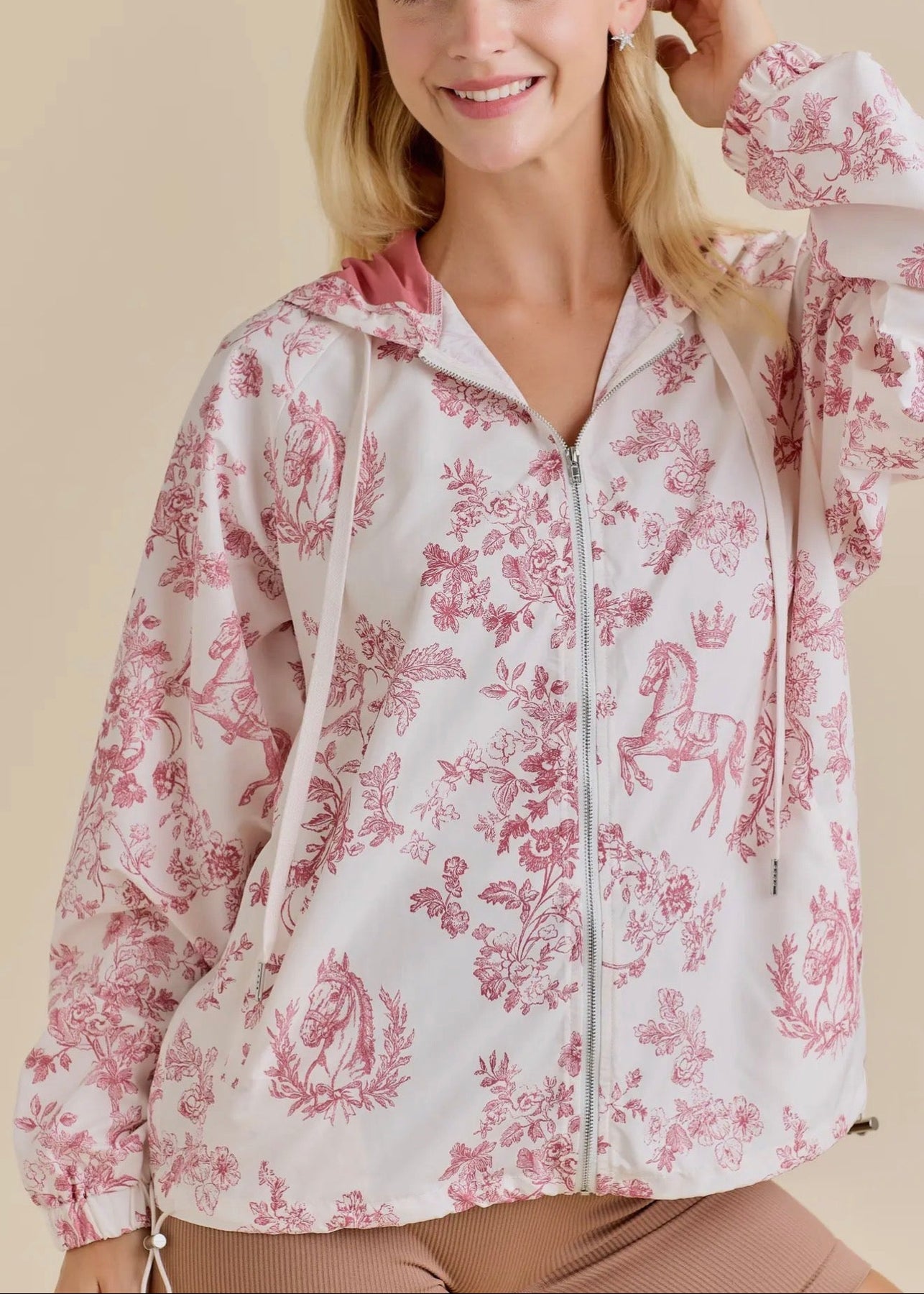 How perfect for Spring! Our Vintage Horse Toile Print Windbreaker Jacket oozes equestrian classic. With it's pretty toile print, the full zipper and hood it will be the one you grab for brunch, the show or tailgate!
